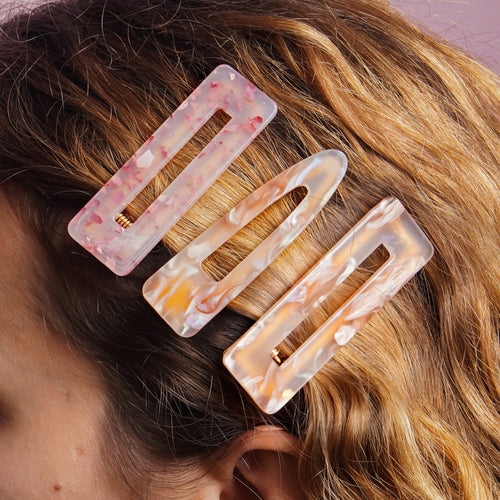 Ces 3 barrettes plates roses et terracotta viendront sublimer vos coiffures. Le trio de barrettes contient 2 formes : carré et triangulaire pour switcher selon les envies. Elles permettent de maintenir les mèches en ajoutant une touche fantaisie aux coiffures les plus simples. À utiliser lors d'une occasion particulière ou au quotidien et à disposer où vous le souhaitez, les Kurl Clips s'adaptent !